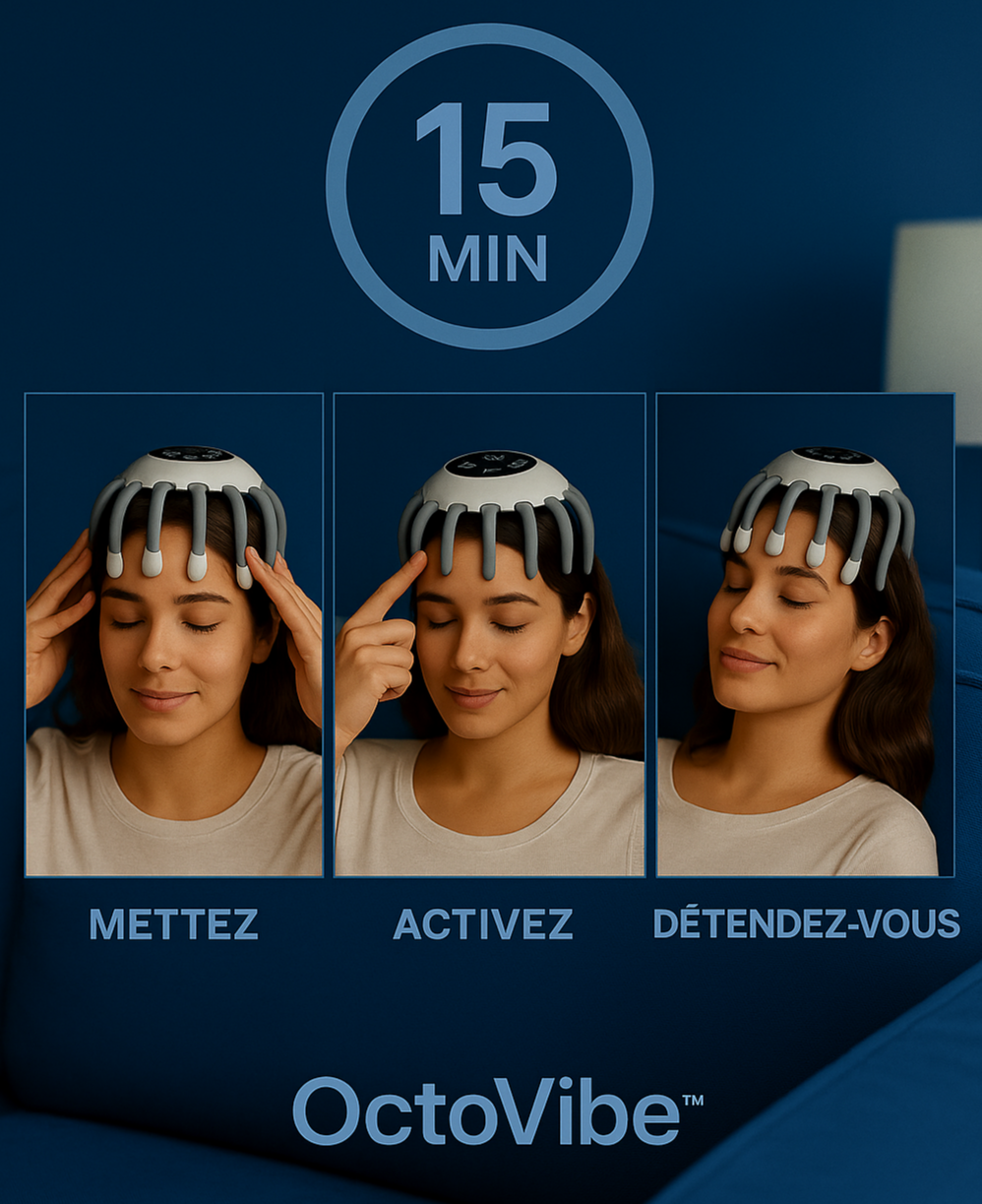 — Chloé R. Juin 2025Acheteur vérifiéeUne révélation pour mes migraines !Je souffre de migraines depuis des années, et depuis que j’utilise OctoVibe™, c’est le jour et la nuit. En 15 minutes, je suis détendue, apaisée, et mes douleurs diminuent. C’est devenu mon rituel du soir. À acheter les yeux fermés !OctoVibe™ – Masseur de Cuir Chevelu Intelligent à 20 Têtes