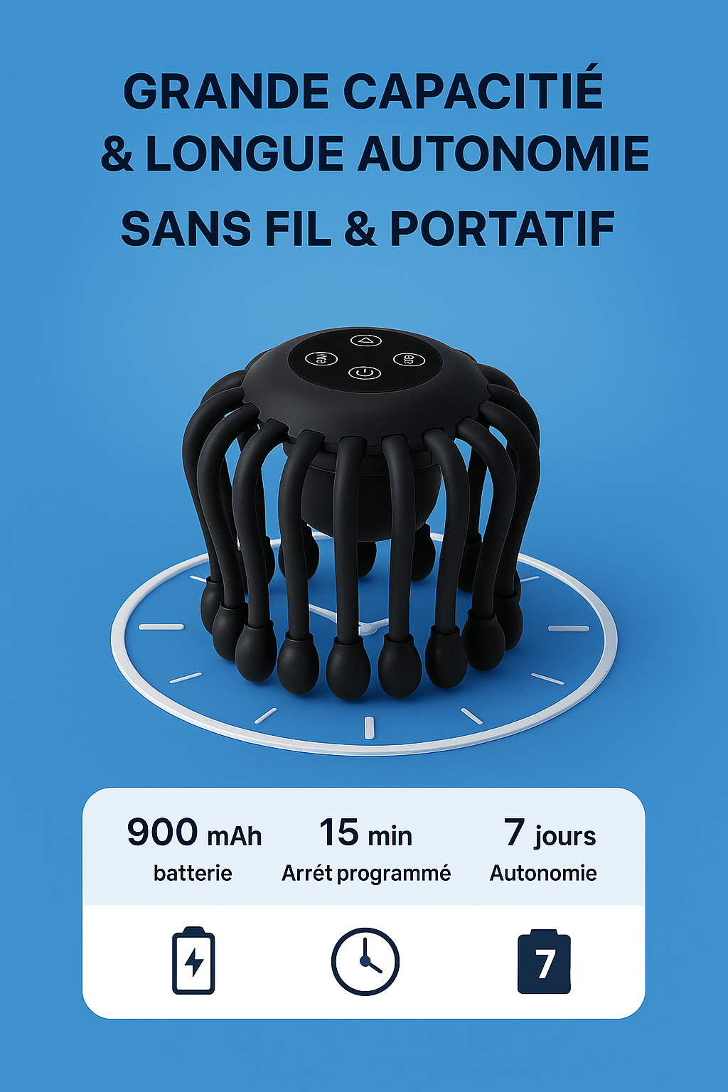 — Inès M. MARS 2025Acheteur vérifiéeRelaxation instantanée garantieCe petit appareil a changé mes fins de journée. En 15 minutes je suis apaisée, mon cuir chevelu est stimulé et mes tensions disparaissent. Et il tient plusieurs jours sans recharge !OctoVibe™ – Masseur de Cuir Chevelu Intelligent à 20 Têtes